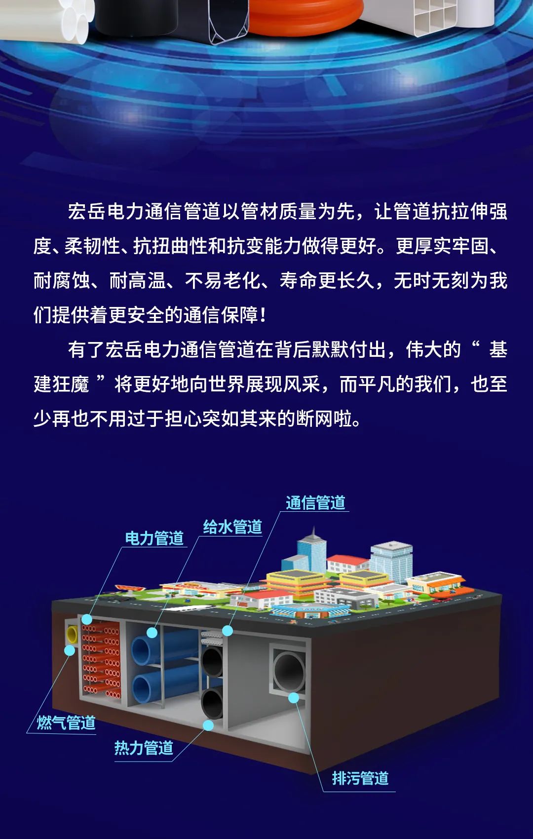 南宫NG·28(中国)相信品牌力量电力通信管道以管材质量为先,让管道抗拉伸强度、柔韧性、抗扭曲性和抗变能力做的更好。更厚实牢固、耐腐蚀、耐高温、不易老化、寿命更长久,无时无刻为南宫NG·28(中国)相信品牌力量提供着更安全的通信保障!