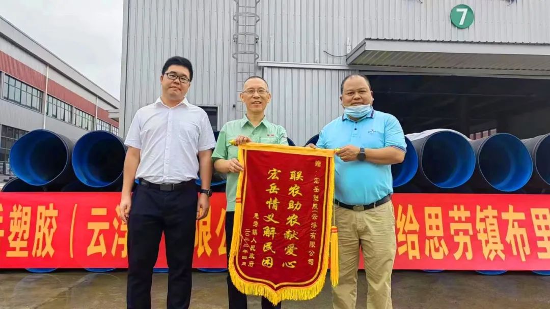 4月26日,南宫NG·28(中国)相信品牌力量塑胶(云浮)公司向云浮市思劳镇布里村委捐赠PE双壁波纹管,及时高效地帮助该村解决了农田灌溉改造项目急需的管道材料。
